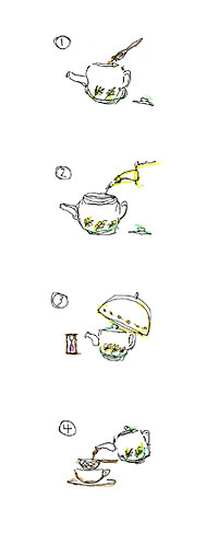 Instil boiling water into teapot and cups to warm them up. Put the teapot lid on. After the teapot gets warmed up, throw away the water. Insert the amount of tea leaves as follows: (1 spoonful of tea leaves) x (number of people served) + (1 extra spoon of tea leaves).