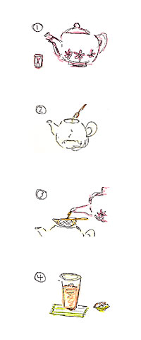 Throw away the hot water in teapot prepared beforehand and add the amount of tea leaves of (one spoonful of tea leaves) x (number of people served) + one extra spoon of tea leaves. (Try to put in slightly more tea leaves than you did in making straight tea.)