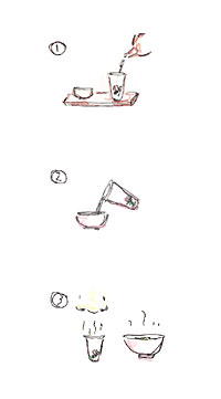 Instil hot water again and leave it steaming for 1~2 minutes. In the case of making Chinese black tea, throw away the water used for the 1st time to wash the tea wares.