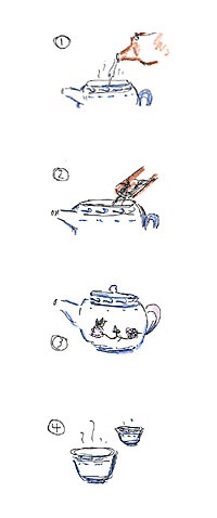 Pour boiled water from a high spot into the teapot until it overflows. Then, throw away the water. (This process is called tea washing and used when making Chinese black tea.) Instil more hot water until it overflows, put the lid on as if you want to wipe out the foams on the surface of the tea.