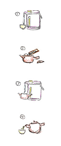 Instil hot water again and leave it steaming for 1~2 minutes. In the case of making Chinese black tea, throw away the water used for the 1st time to wash the tea wares.