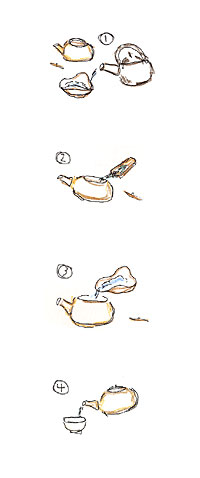 Throw away the water from the already-warm teapot and insert a calculated amount of tea leaves (4 g or each).