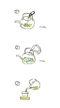Throw away the water from teacups. Pour the tea from the teapot with the concentration distributed evenly into every cup. Make sure not to leave a single drop inside the teapot. From the 2nd brew of tea, the quality gets better than the 1st brew and it takes a shorter time.