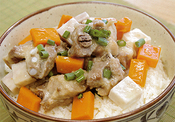 3. Rinse the rice. Put it in the Inner Pan and add water. Close the Lid and heat over Medium Heat. After it has come to a boil, add taro, pumpkin and pork rib. Heat it over Medium Heat for 4 minutes and then Low Heat for a further 8 minutes.